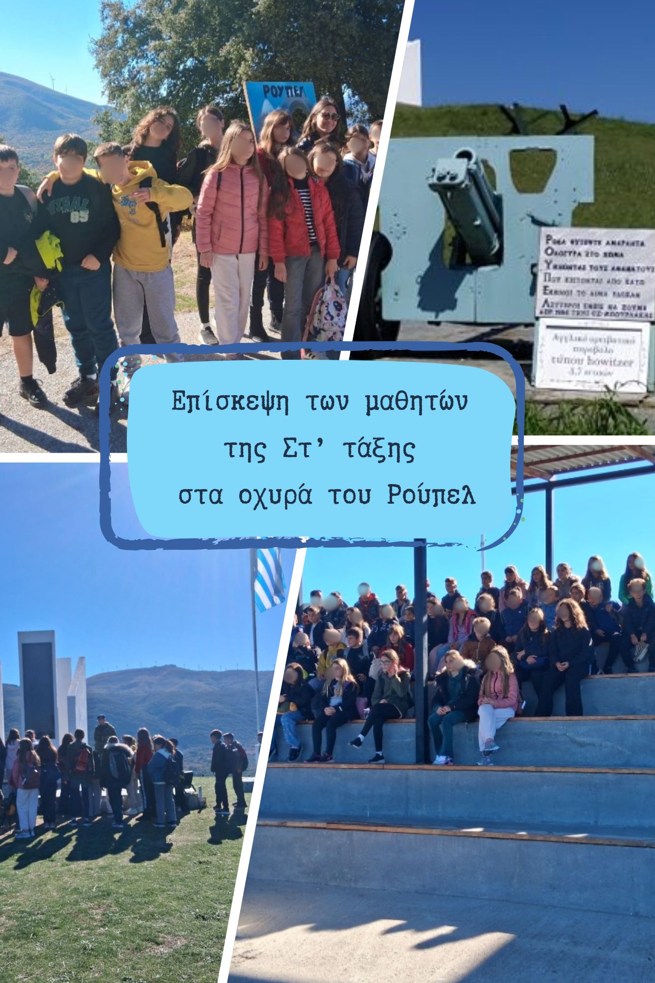 Οι μαθητές της Στ’ τάξης του σχολείου μας επισκέφθηκαν τα οχυρά του Ρούπελ και ξεναγήθηκαν στους ιστορικούς χώρους τους. Γνώρισαν τον τρόπο διαβίωσης των στρατιωτών