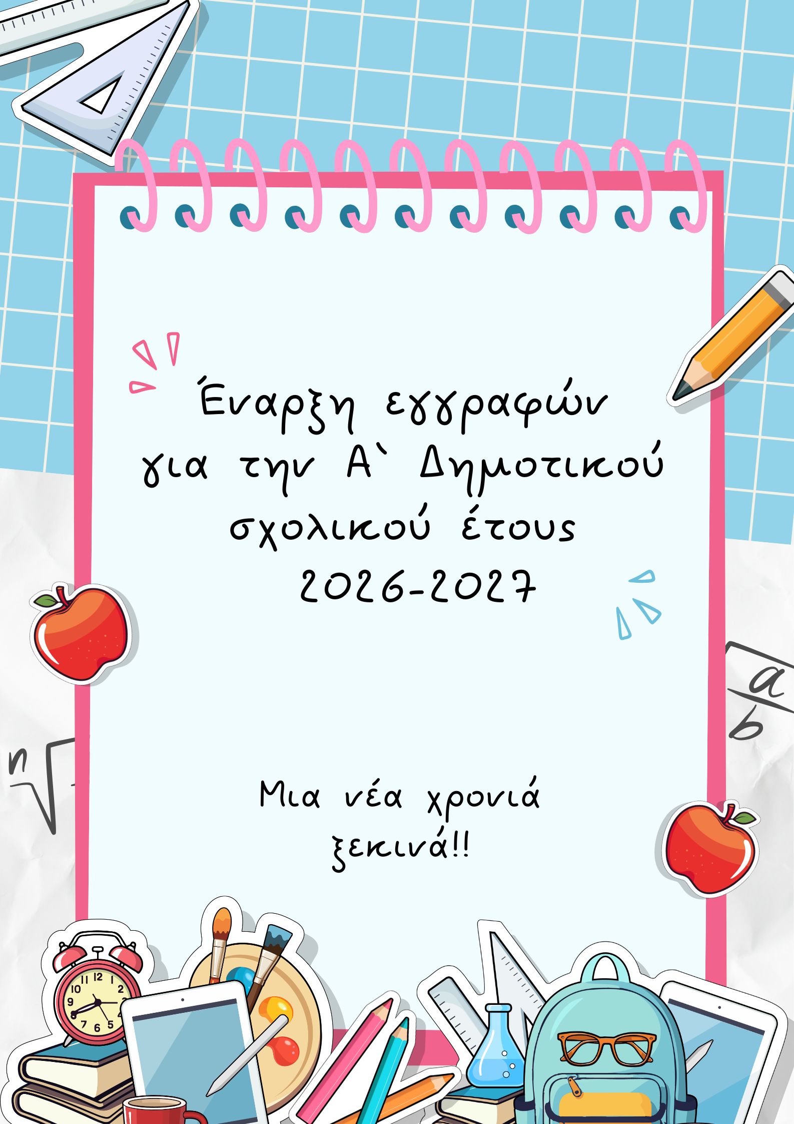 Αγαπητοί γονείς Σας ενημερώνουμε ότι, σύμφωνα με την υπ’ αρ. πρωτ. Φ.6/23198/Δ1/25-02-2026 εγκύκλιο του Υπουργείο Παιδείας, Θρησκευμάτων και Αθλητισμού, οι εγγραφές μαθητών/τριών στην Α΄ Τάξη