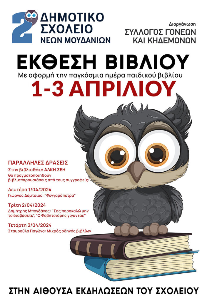 Η έκθεση θα πραγματοποιηθεί 1, 2 και 3 Απριλίου 2024 από τις 12.30 έως τις 14.00 στην αίθουσα εκδηλώσεων του σχολείου μας, όπου οι μαθητές θα μπορούν να επιλέξουν κάποιο βιβλίο.