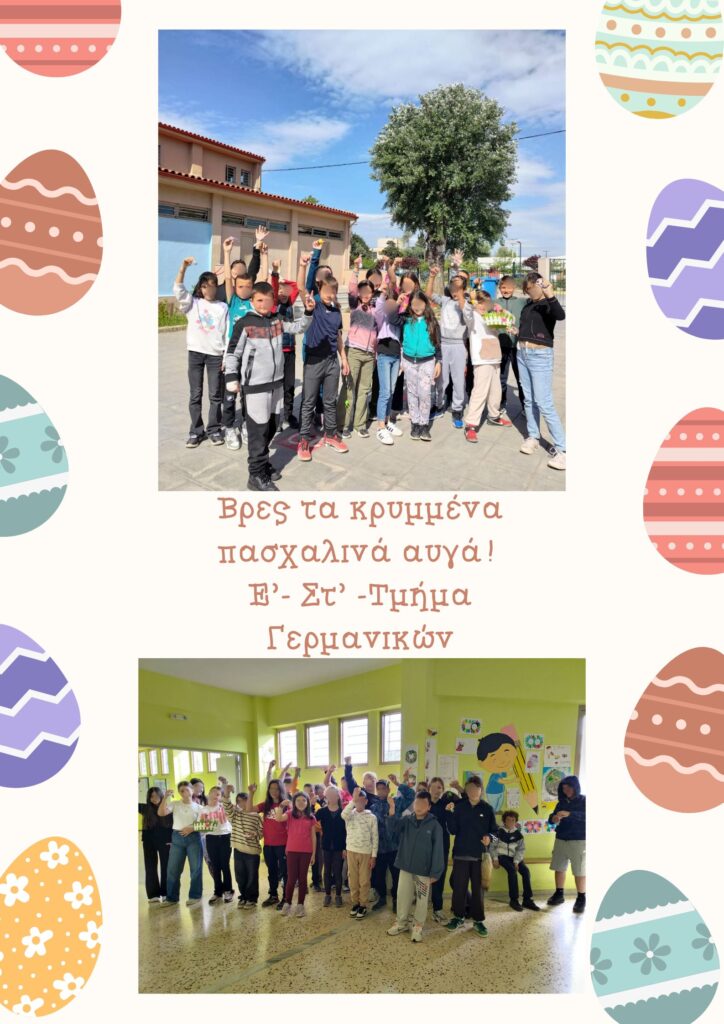 Λίγο πριν τις διακοπές του Πάσχα, η εκπαιδευτικός των Γερμανικών του σχολείου μας, κ. Άννα Μαυρίδου, αποφάσισε να αποχαιρετήσει τα παιδιά με ένα πολύ όμορφο παραδοσιακό γερμανικό παιχνίδι. Οι Ε’ και Στ΄ τάξεις μας, έψαξαν και βρήκαν τα κρυμμένα πασχαλινά αυγά στην αυλή του σχολείου μας! Στο τέλος τα μοιράστηκαν και τα απόλαυσαν με χαρά!