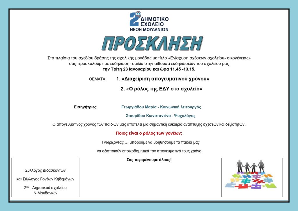 Την Τρίτη 23 Ιανουαρίου πραγματοποιήθηκε στην αίθουσα εκδηλώσεων του Δημοτικού Σχολείου ενημερωτική ομιλία με θέματα τον ρόλο της ΕΔΥ στο σχολικό πλαίσιο και την αξιοποίηση του απογευματινού χρόνου για την ανάπτυξη των δεξιοτήτων των μαθητών και την ενδυνάμωση της σχέσης γονέων -παιδιών.
