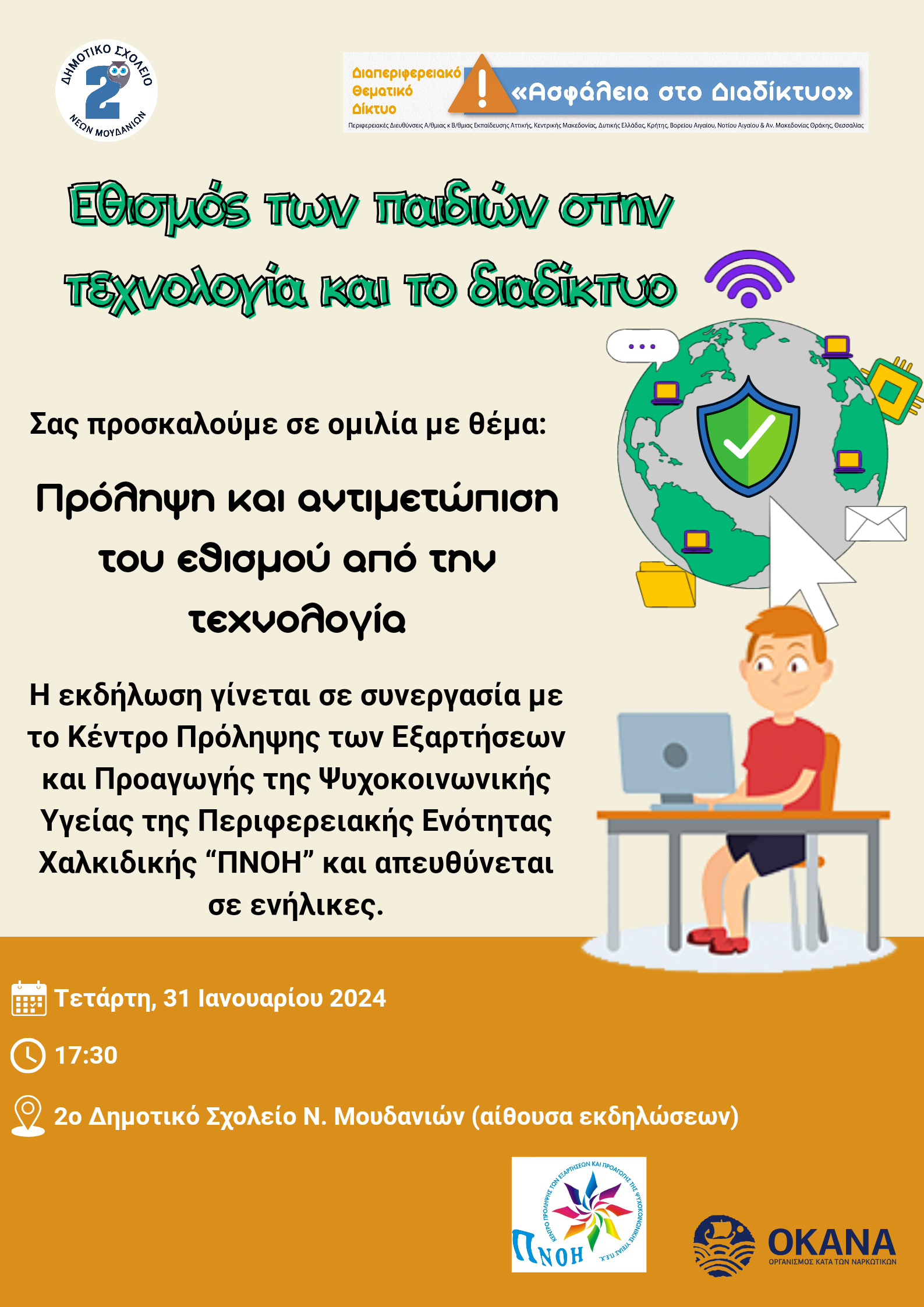 Την Τετάρτη 31 Ιανουαρίου 2024 πραγματοποιήθηκε στην αίθουσα εκδηλώσεων του Δημοτικού Σχολείου ενημερωτική ομιλία από την κ. Παπαλάμπρου Βασιλική, κοινωνιολόγο / επιστημονική διευθύντρια του κέντρου “ΠΝΟΗ”, σε συνεργασία με τον ΟΚΑΝΑ. Κατά τη διάρκεια της εκδήλωσης συζητήθηκαν θέματα σχετικά με την προβληματική χρήση του διαδικτύου και των ηλεκτρονικών συσκευών.