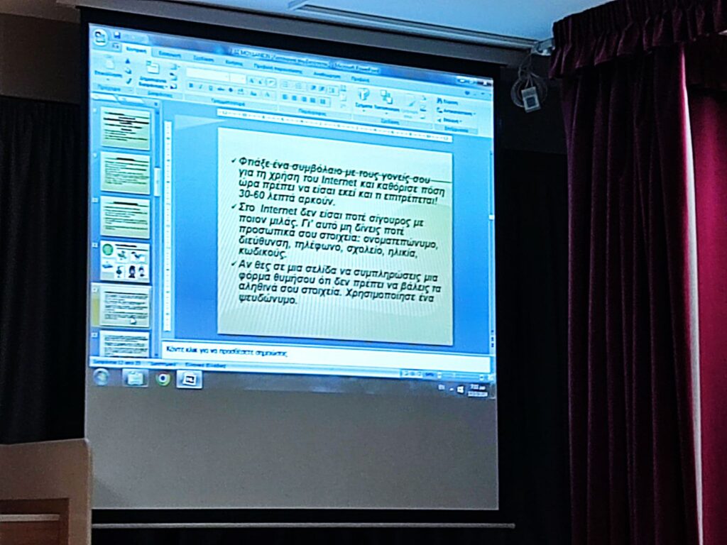 Την Τετάρτη 31 Ιανουαρίου 2024 πραγματοποιήθηκε στην αίθουσα εκδηλώσεων του Δημοτικού Σχολείου ενημερωτική ομιλία από την κ. Παπαλάμπρου Βασιλική, κοινωνιολόγο / επιστημονική διευθύντρια του κέντρου “ΠΝΟΗ”, σε συνεργασία με τον ΟΚΑΝΑ. Κατά τη διάρκεια της εκδήλωσης συζητήθηκαν θέματα σχετικά με την προβληματική χρήση του διαδικτύου και των ηλεκτρονικών συσκευών.