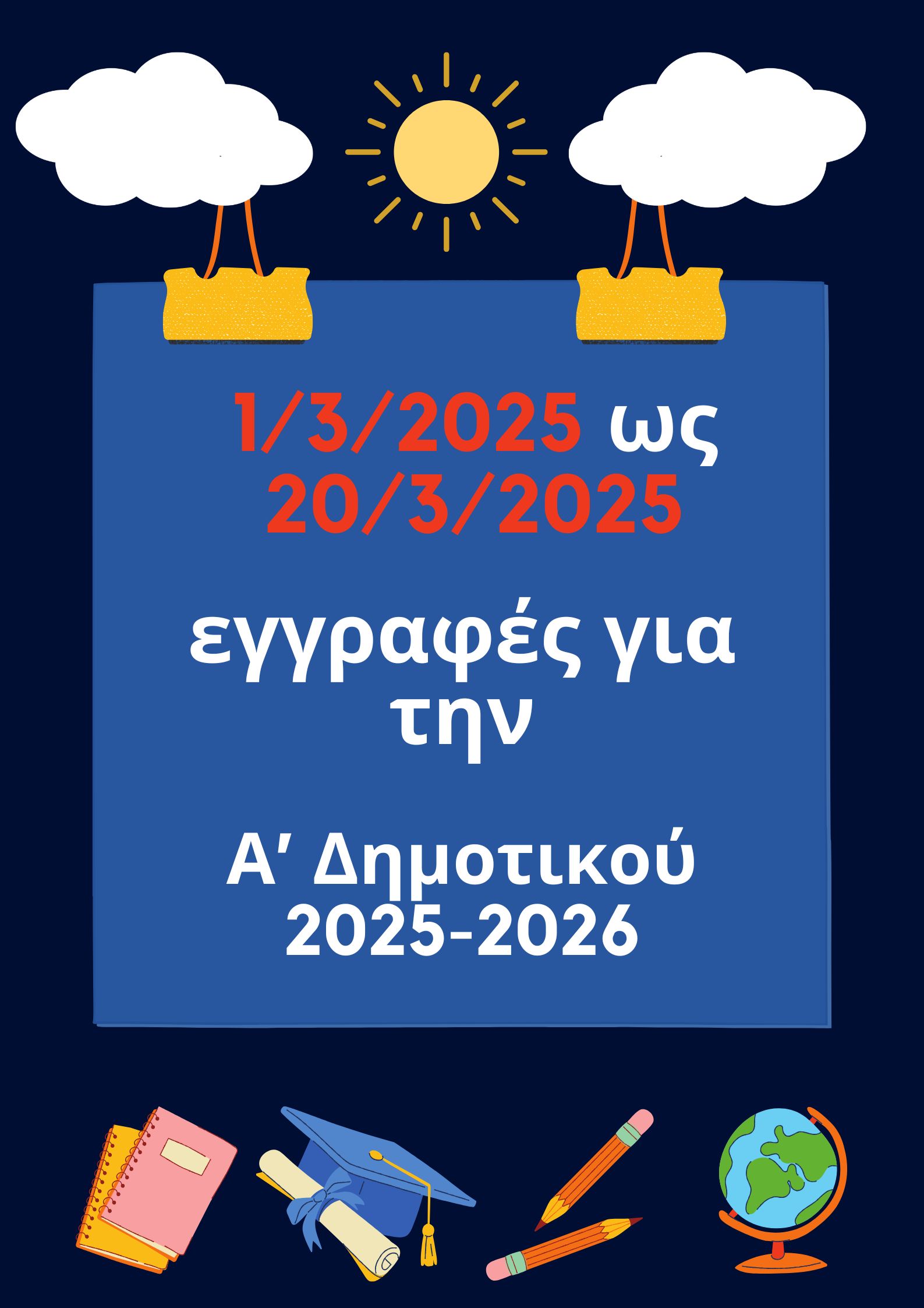 Το διάστημα από το Σάββατο 1η Μαρτίου 2025 ως και την Πέμπτη 20 Μαρτίου 2025 καλούνται οι γονείς να πραγματοποιήσουν την εγγραφή του παιδιού τους στην Α’ Δημοτικού.